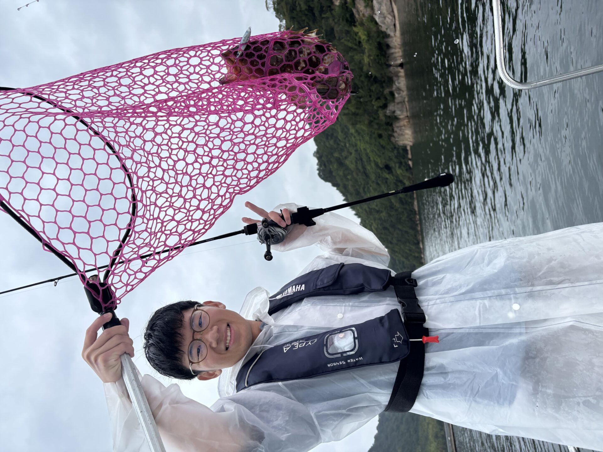 早速釣れるか心配になりながらの出航.雨に備えて全員レインコート着用