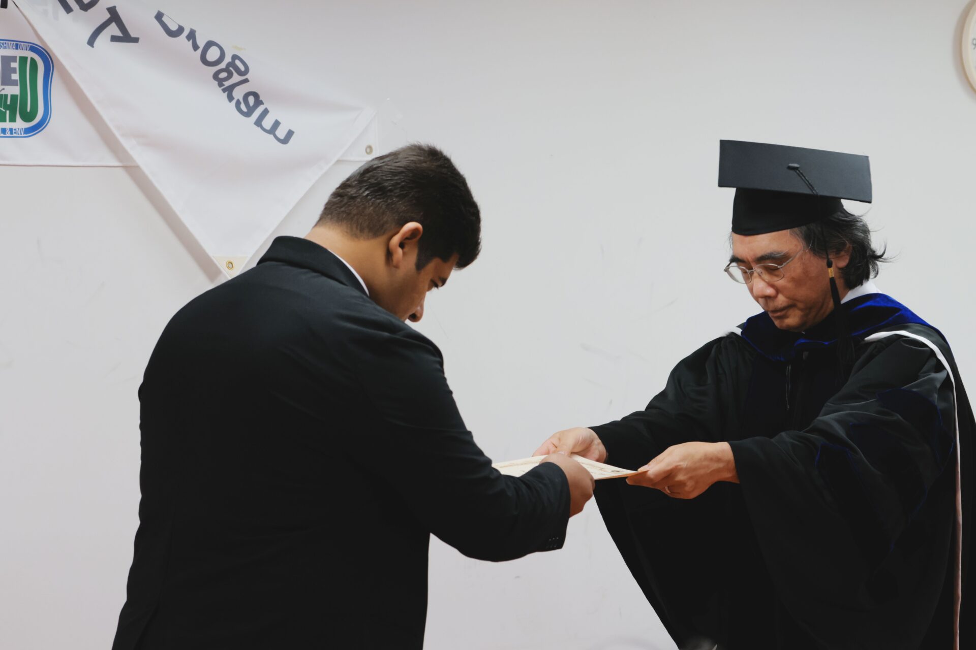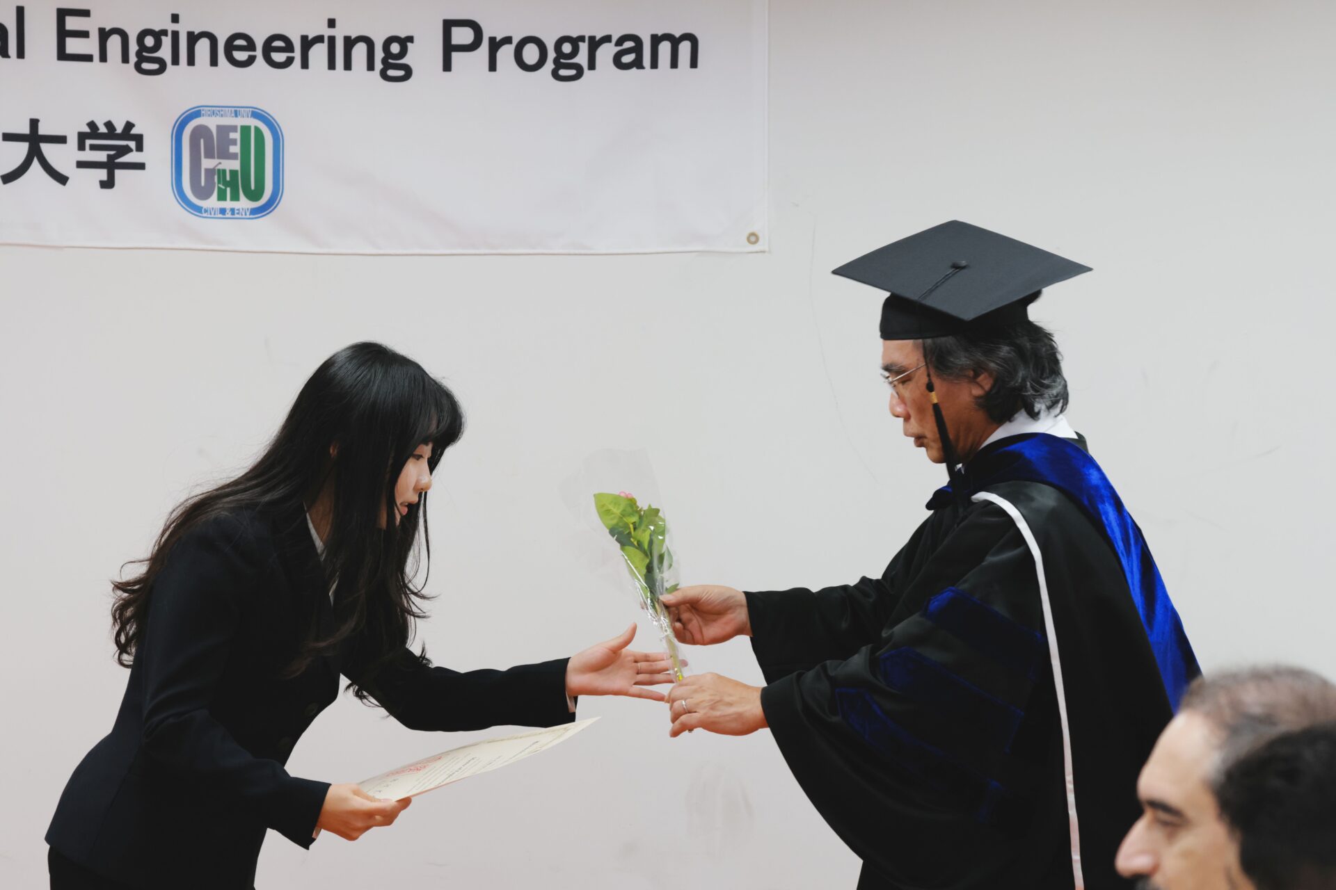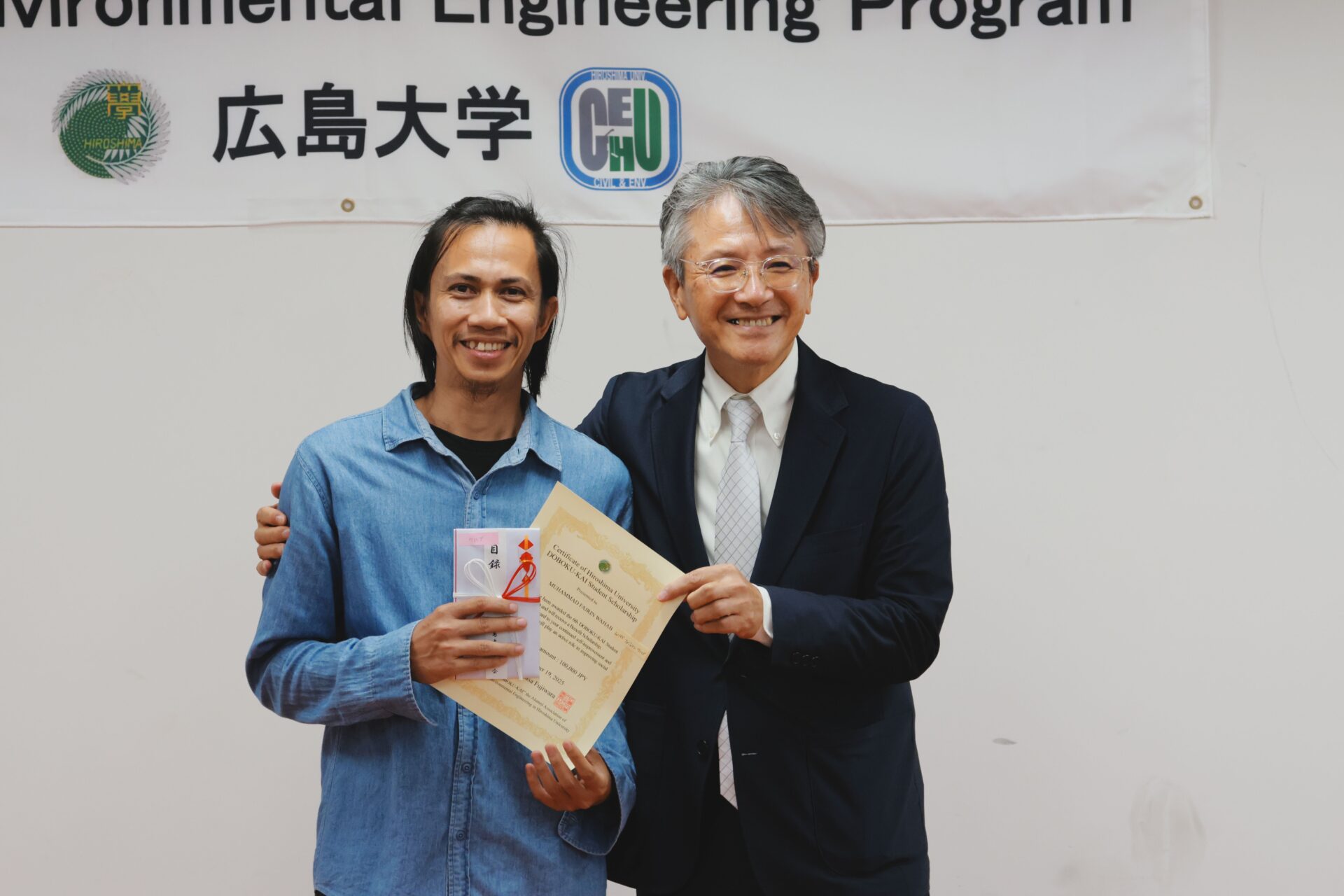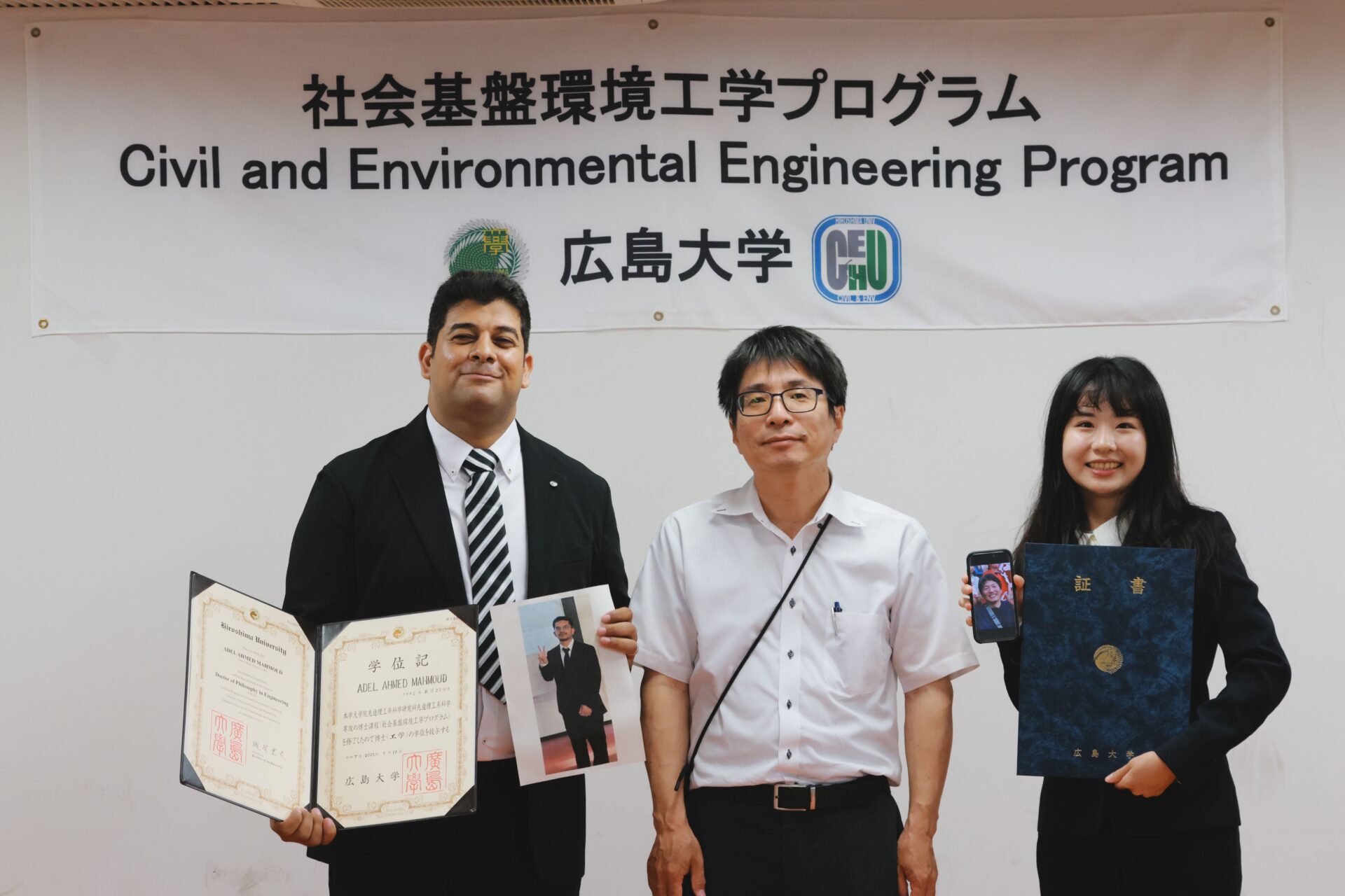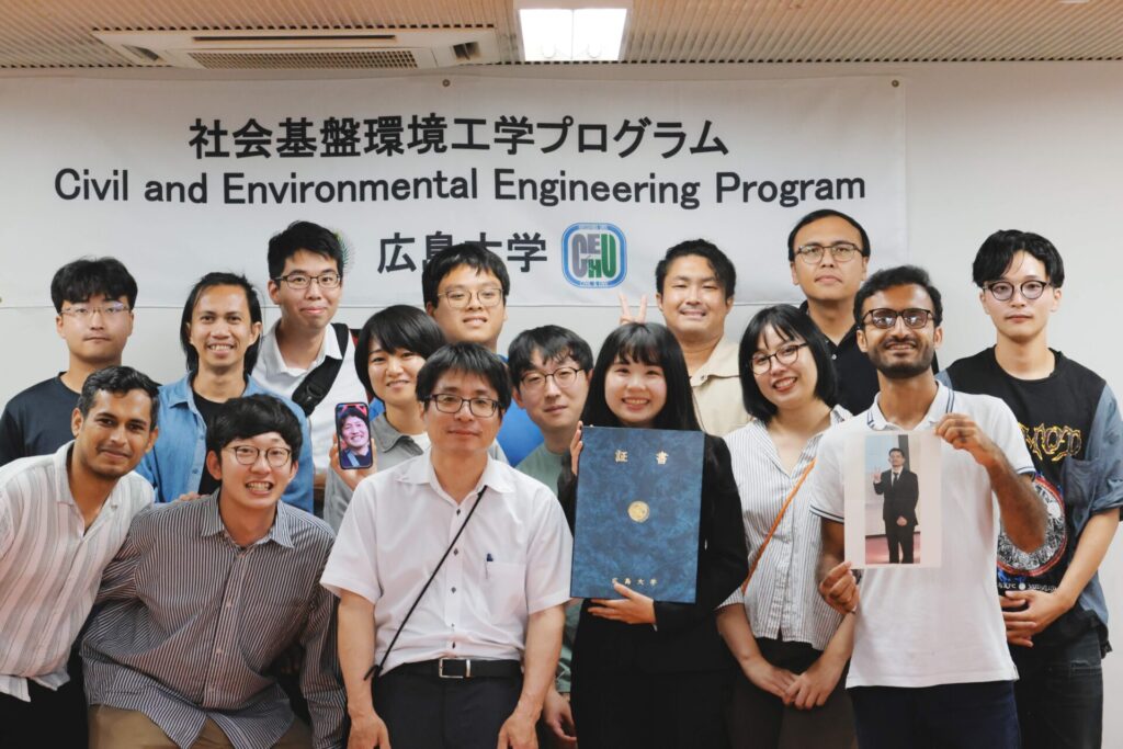 From our lab, three members graduated. These members were Dr. Adel Ahmed Mahmoud (PhD), Dr. Yogi Sahat Maruli Simanjuntak (PhD), and Yu Chiao Chu (Masters). We attended their certificate conferment ceremony at Manabi Lab at the A2 building of the Graduate School of Advanced Science and Engineering. Unfortunately, Dr. Inoue and Dr. Simanjuntak were unable to attend the ceremony because of matters outside the country but they were with us in spirit, also in digital and printed media nevertheless (see image below). On top of the graduation ceremony, an award ceremony for the recipients of the Doboku-kai Scholarship was also held and we were fortunate enough that one of our lab members, Muhammad Fajrin Wahab was selected as one of the lucky recipients of this scholarship. Finally, we would like to wish all the best to our graduates in their future endeavors and we also hope that our paths may cross again someday in the future.